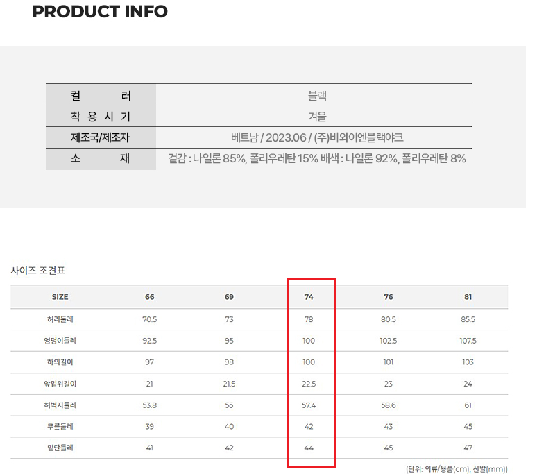 그래서 선택한 사이즈는 여성 74
