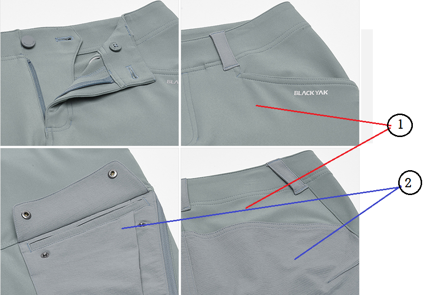엉덩이와 무릎앞면부, 바지밑단부분 그리고 전면 포켓은 질긴 케브라원단으로 방수 원단으로 구성되어 있어 2가지 원단이 적절한 위치에 배치되어 있다.
