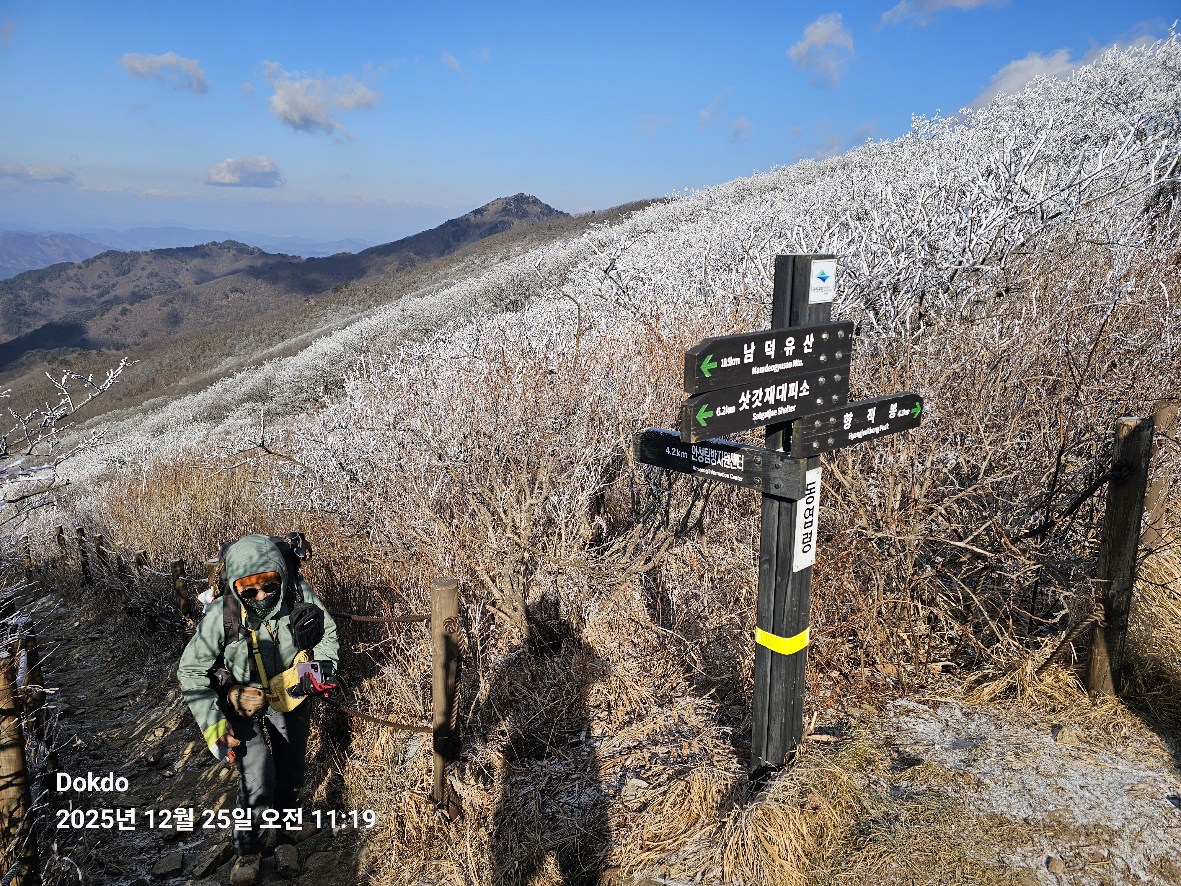 매서운 바람으로 플야인증 이고 뭐고 생략하고 남덕유산 정석석만 한컷찍고 바로 되돌아 아이젠도 없이 어음길을 피해 계속진행.