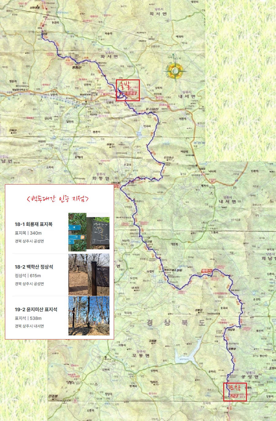 산방기간이라 소백산 및 월악산국립공원을 패스하고 곧바로 경북 상주쪽으로 내려와 화령재에서 큰재까지 진행한다.