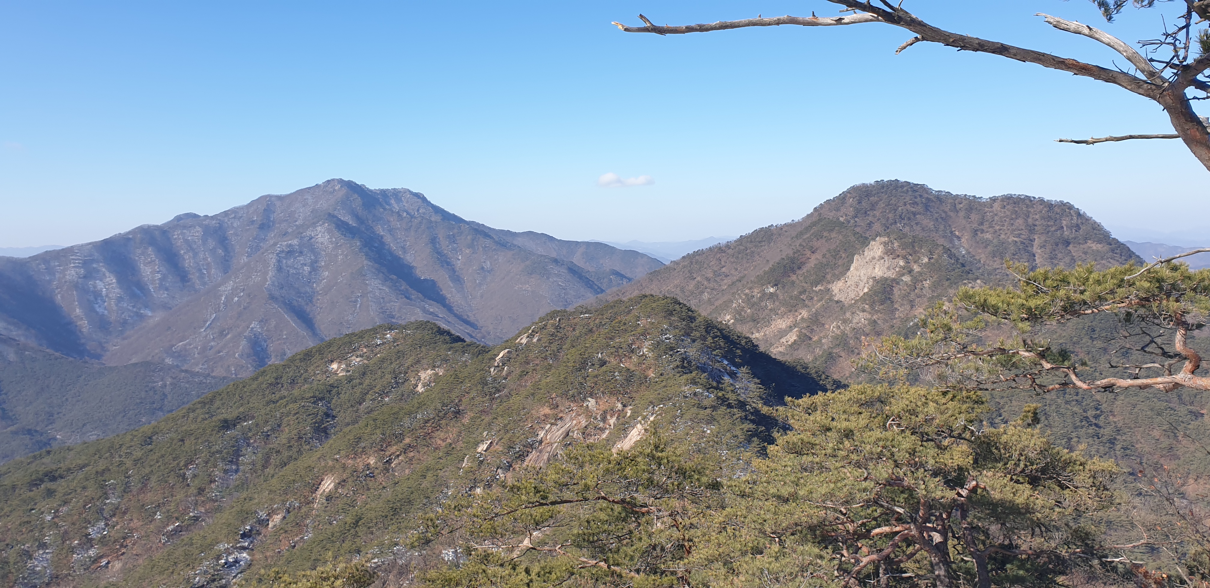 좌측에 희양산이 조망되고, 중앙우측에 장성봉과 대야산이 조망됩니다.