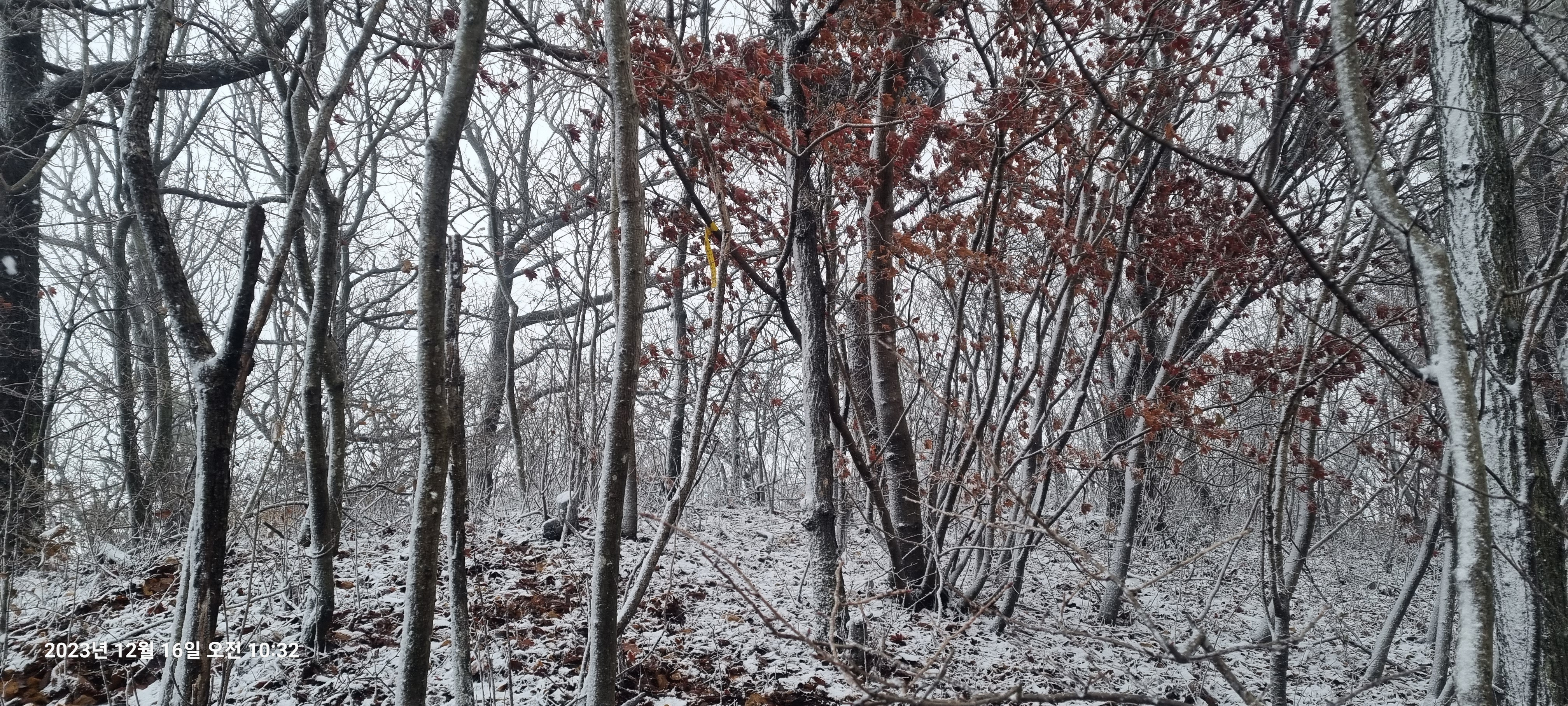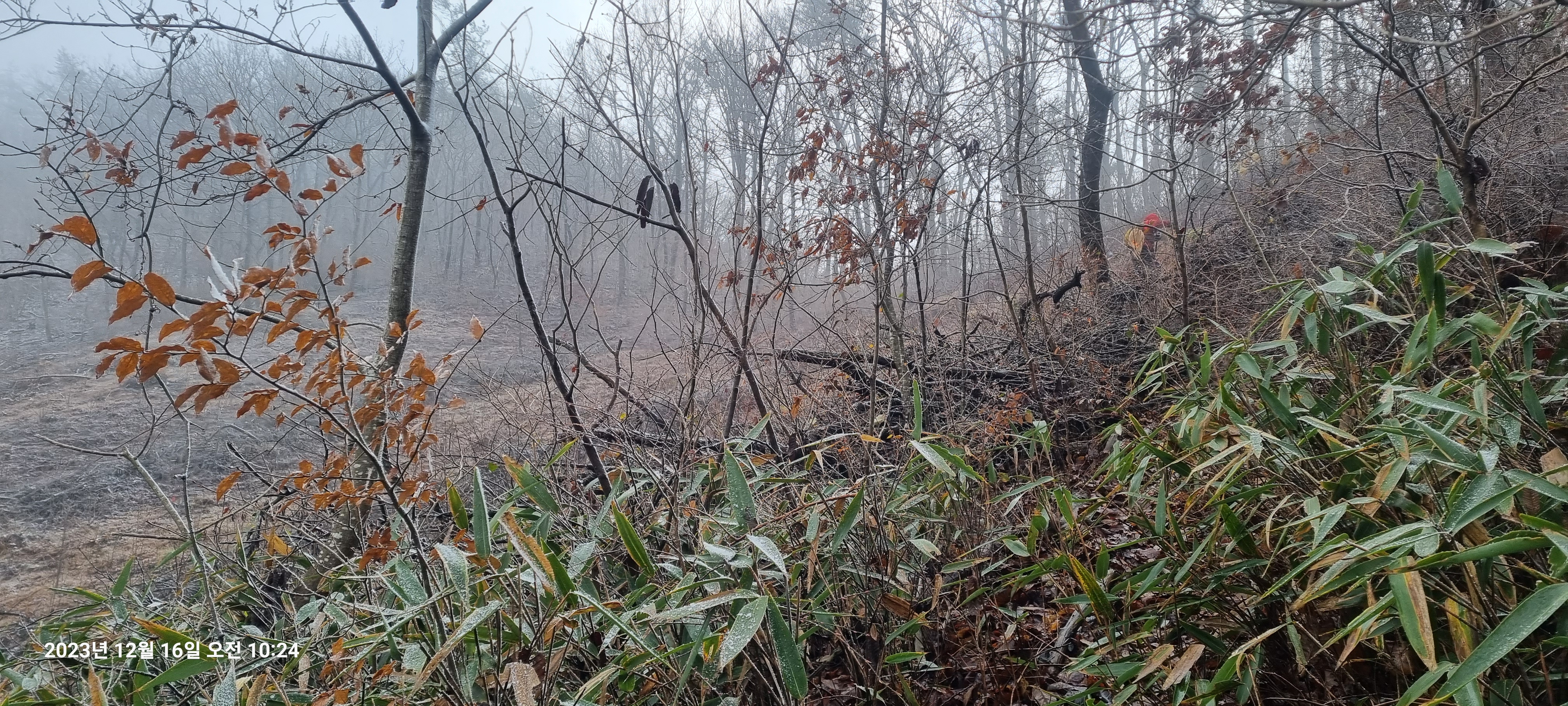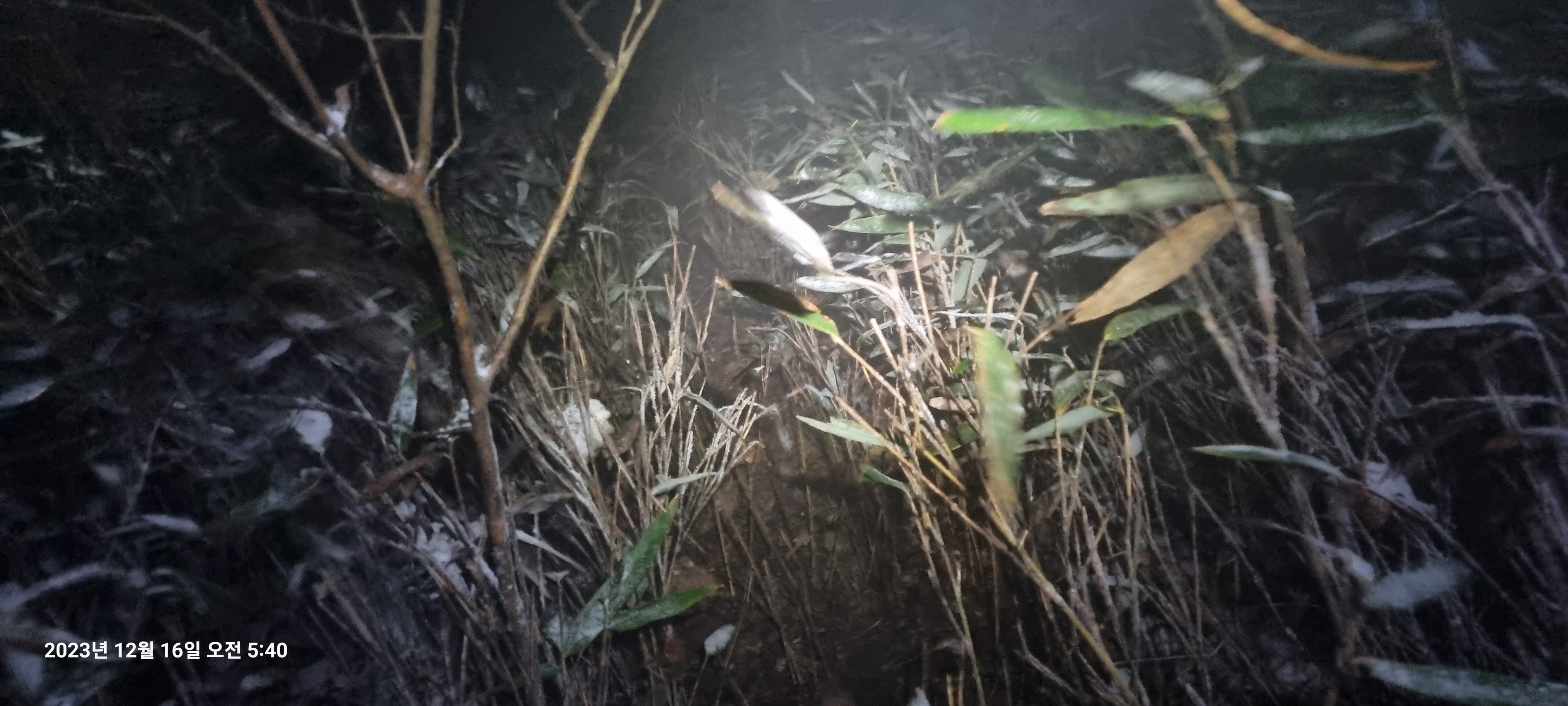 국사봉 내리막은 급경사에다가 비에서 눈으로 바뀐 눈때문에 매우 미끄럽고 조릿대때문에 성가시기도 합니다.