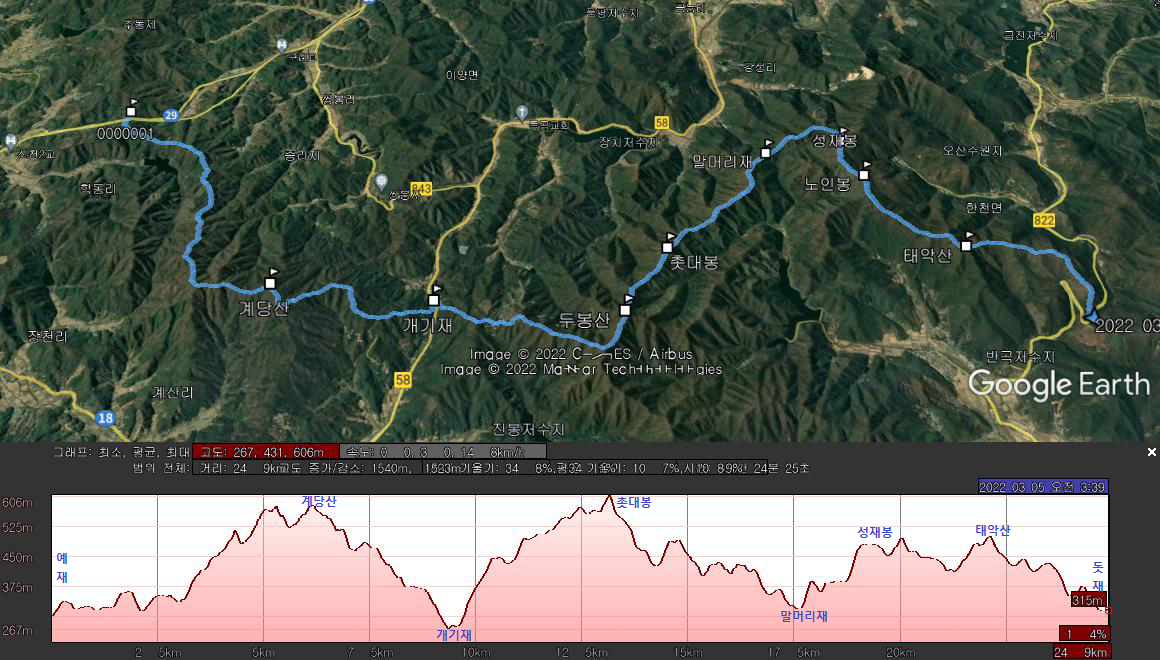 4. 산행실거리 및 시간 : 예재-계당산-개기재-촛대봉-성재봉-태악산-돗재 (26km/8.4시간-최종후미/9.7시간) -난이도 : 중상
