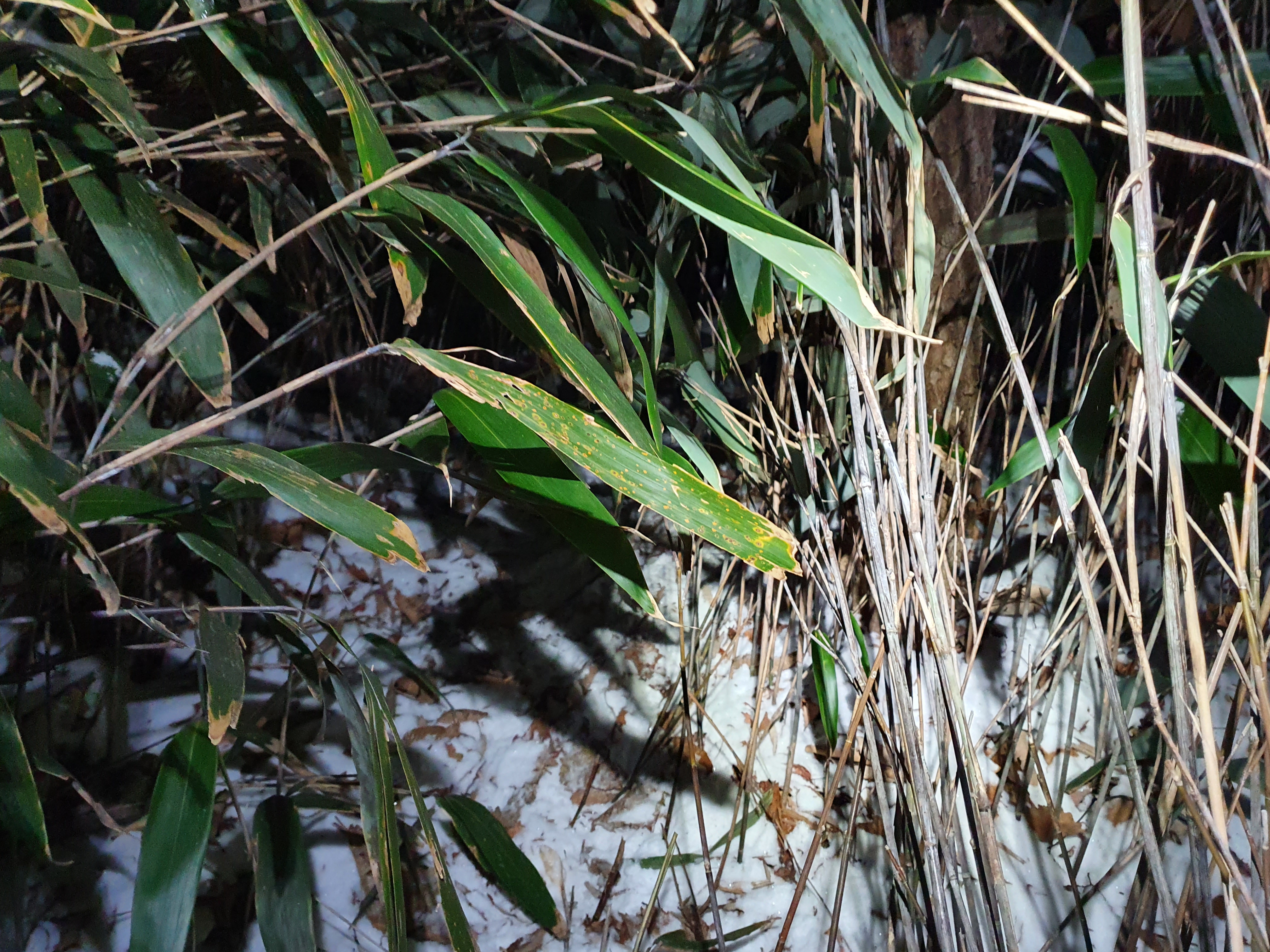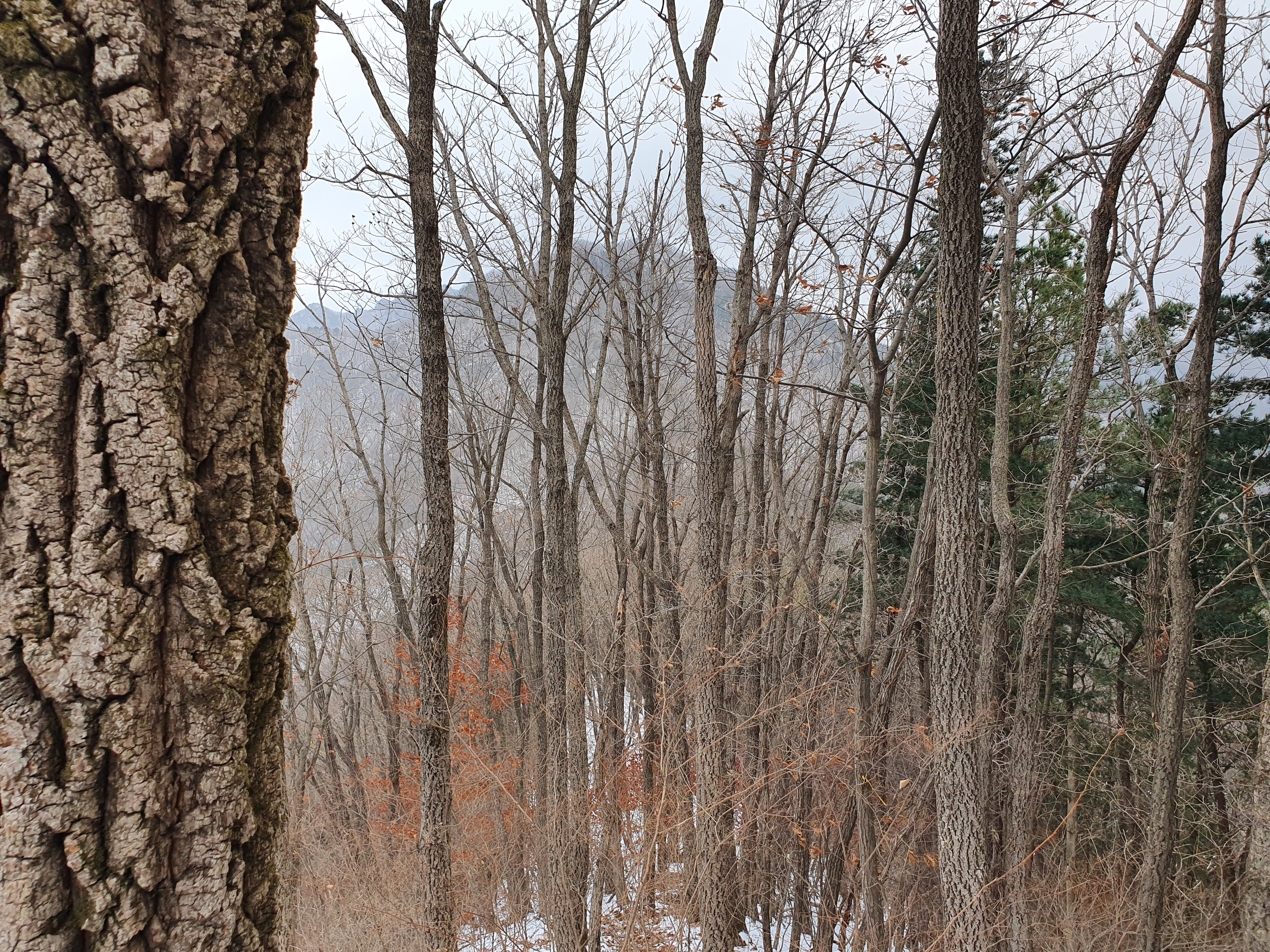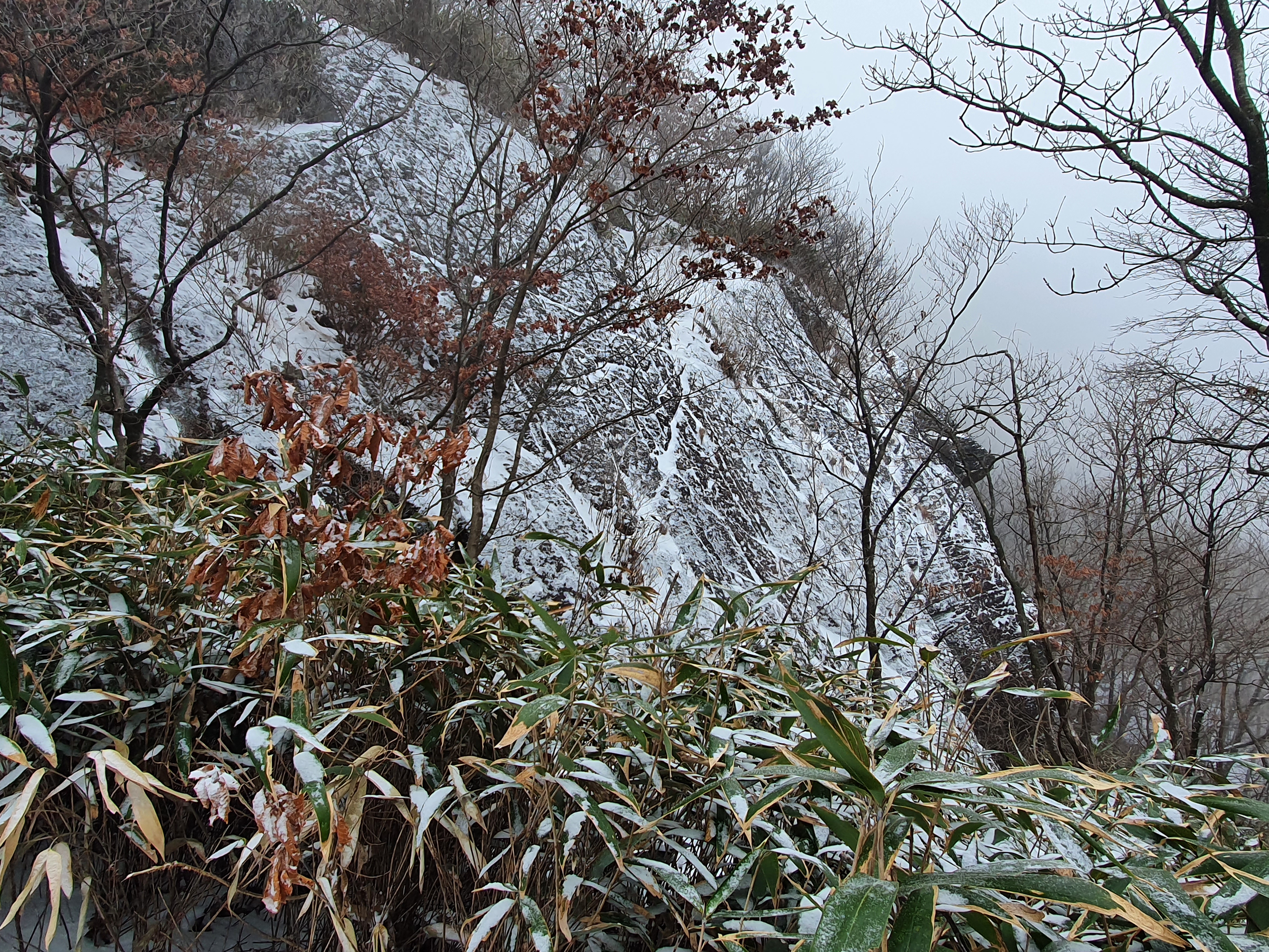 어제 내린 눈이 얇게 낙엽을 뒤덮었지만,