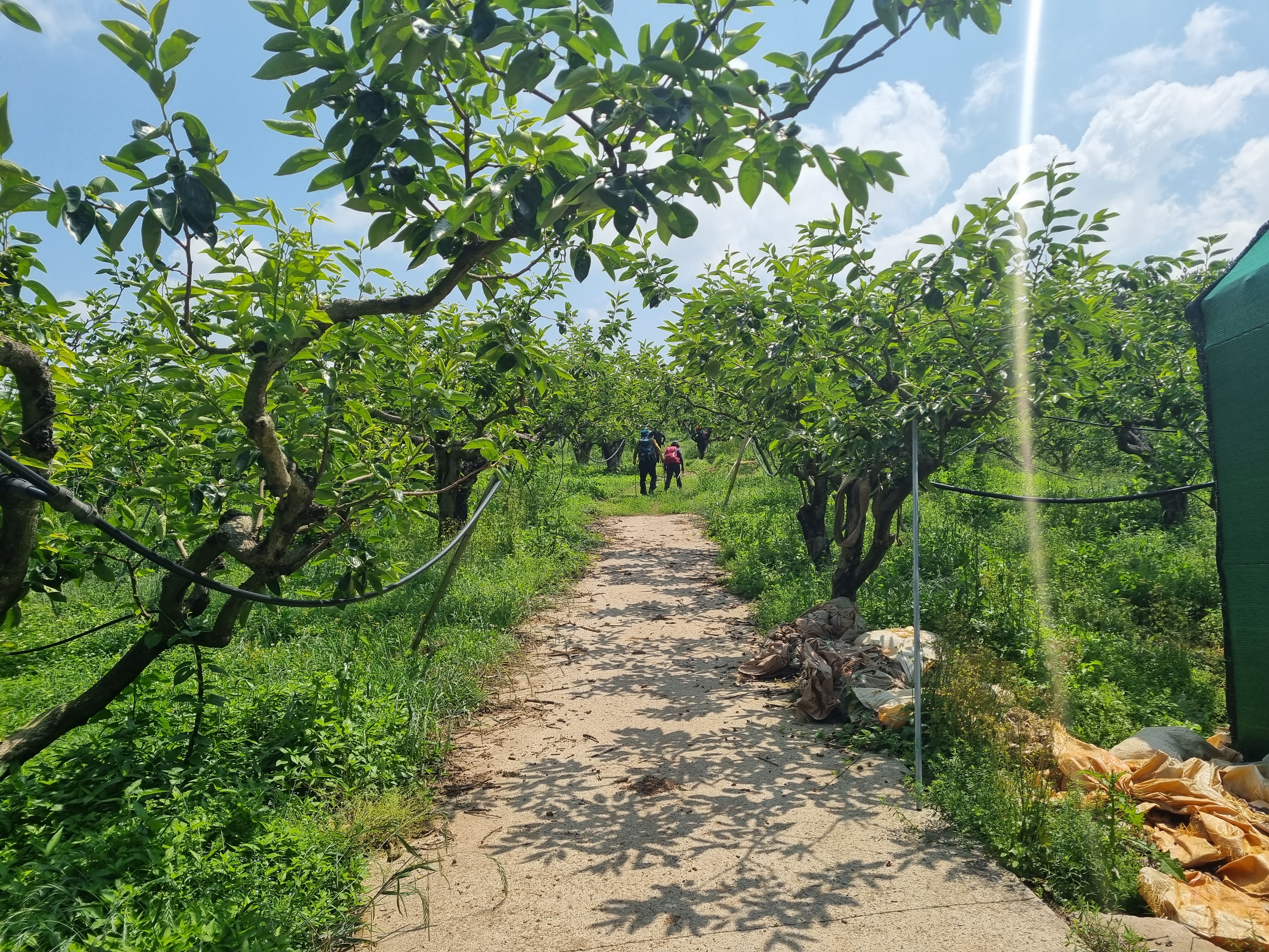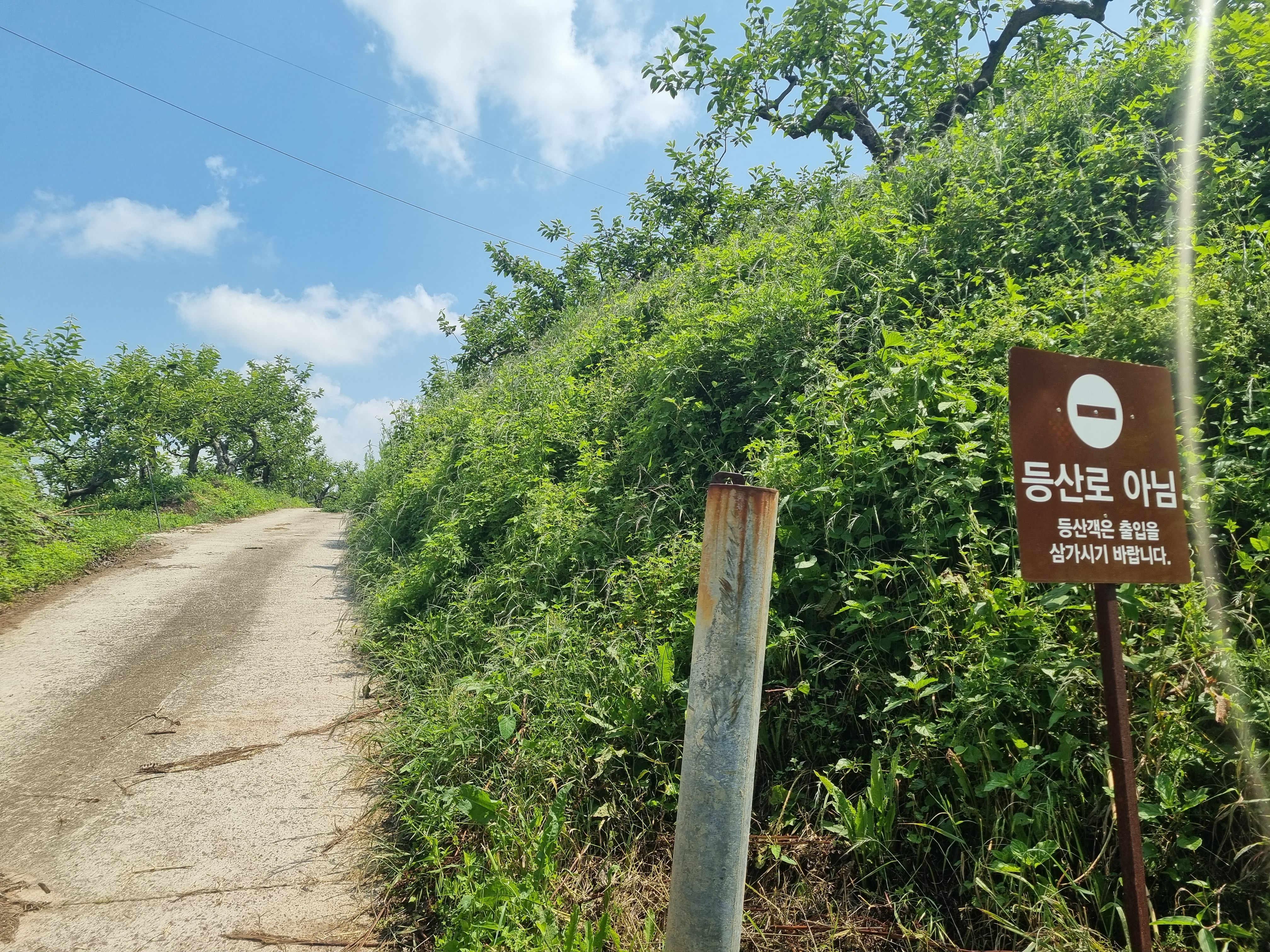마을로 내려서서 도로를 우회하여 과수원 입구에서 맥길을 이어갑니다.