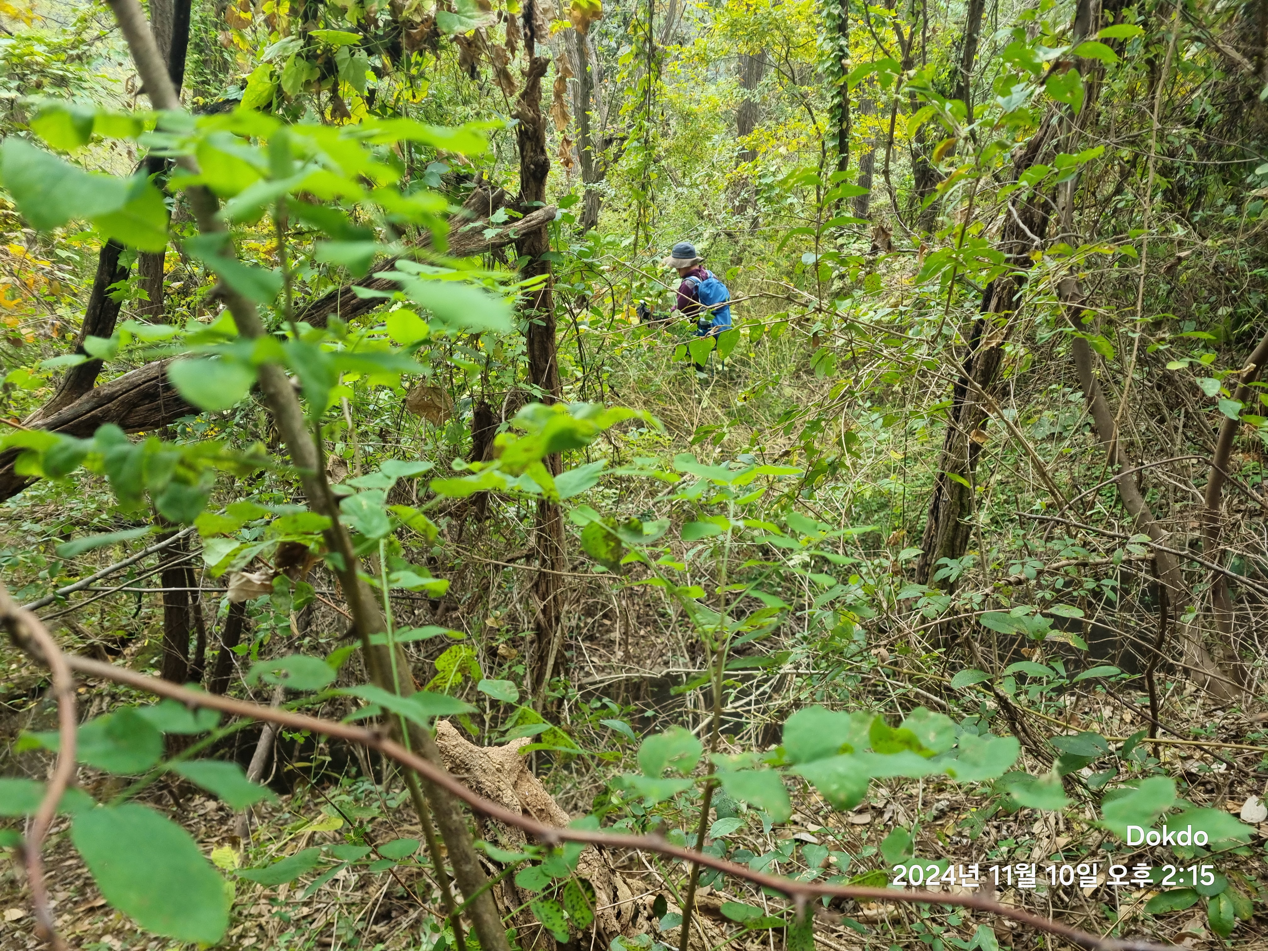 약200m의 거리를 가시와 덩굴 그리고 잡목을 헤치고 가까스로 탈출하여 날머리인 밤실재에 도착